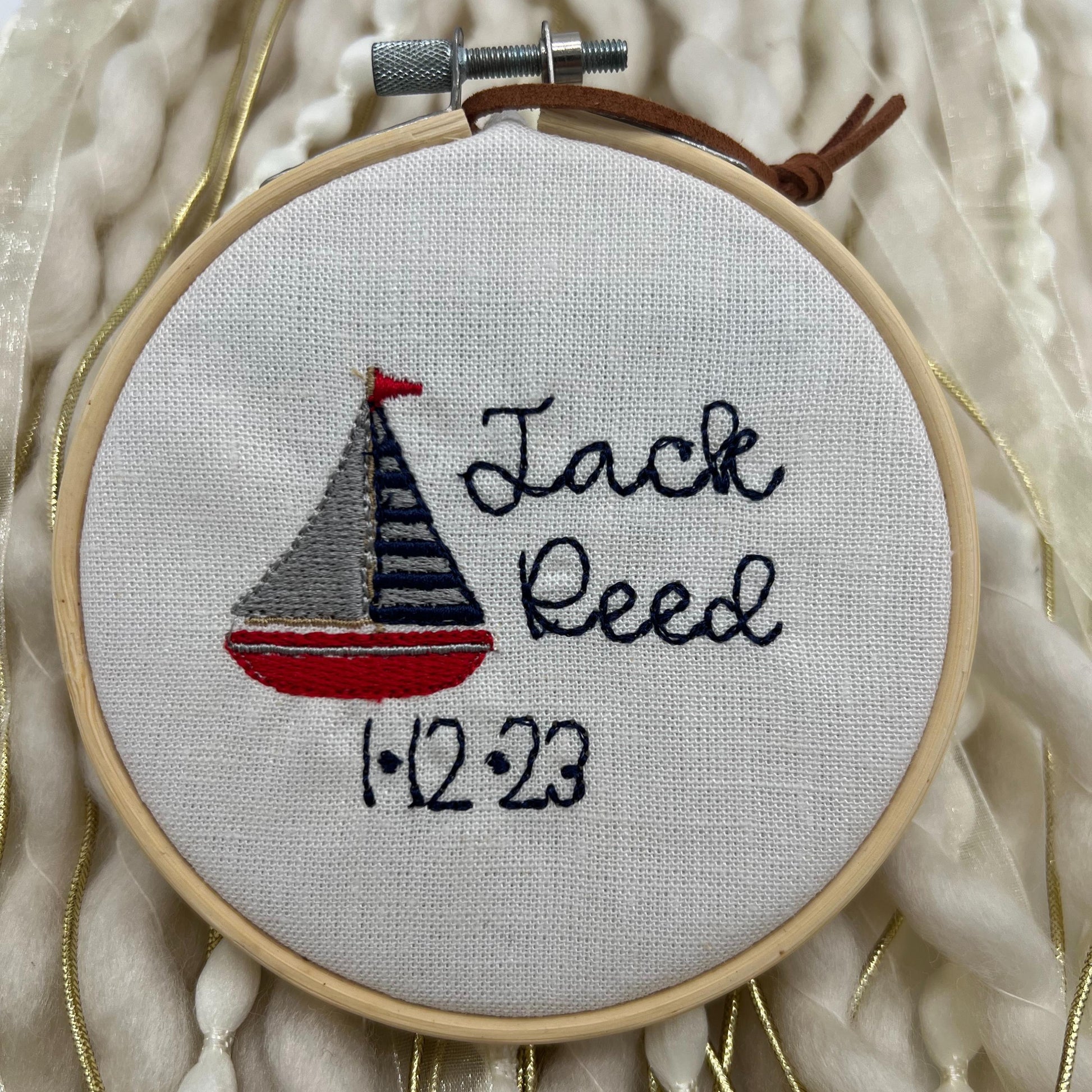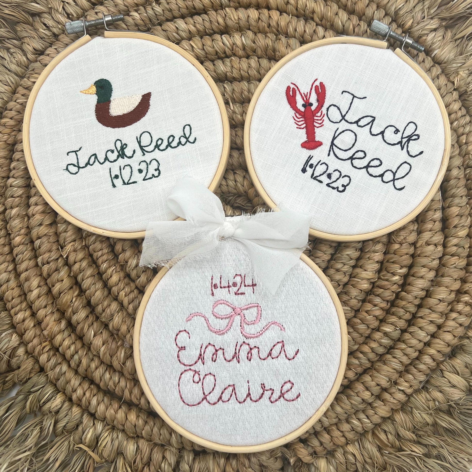 Celebrate the arrival of your bundle of joy with a custom embroidered name hoop, a delightful baby birth announcement sign that doubles as personalized embroidery hoop baby name wall art, ensuring a cherished keepsake and a unique baby shower gift ornament.