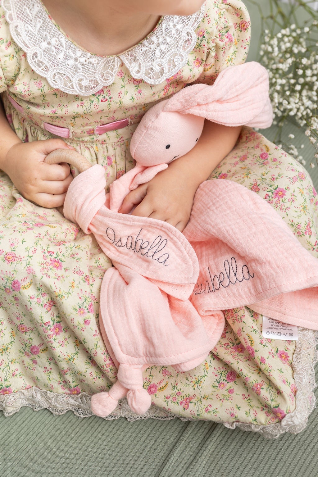 Personalized Baby Gift Embroidered Organic Cotton Muslin Lovey for Baby Gift Set Baby Girl Gift Montessori Baby Gift Bunny Lovey Baby Lovey