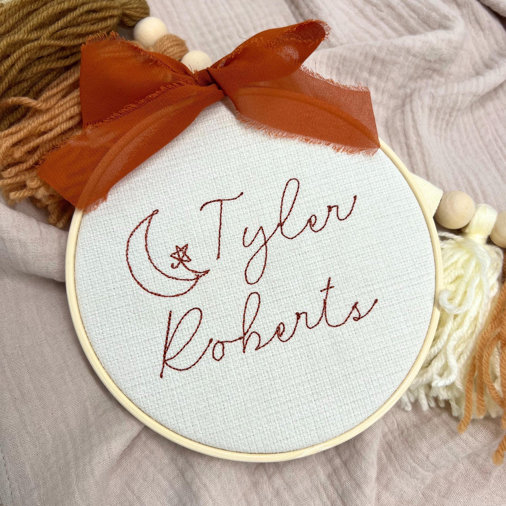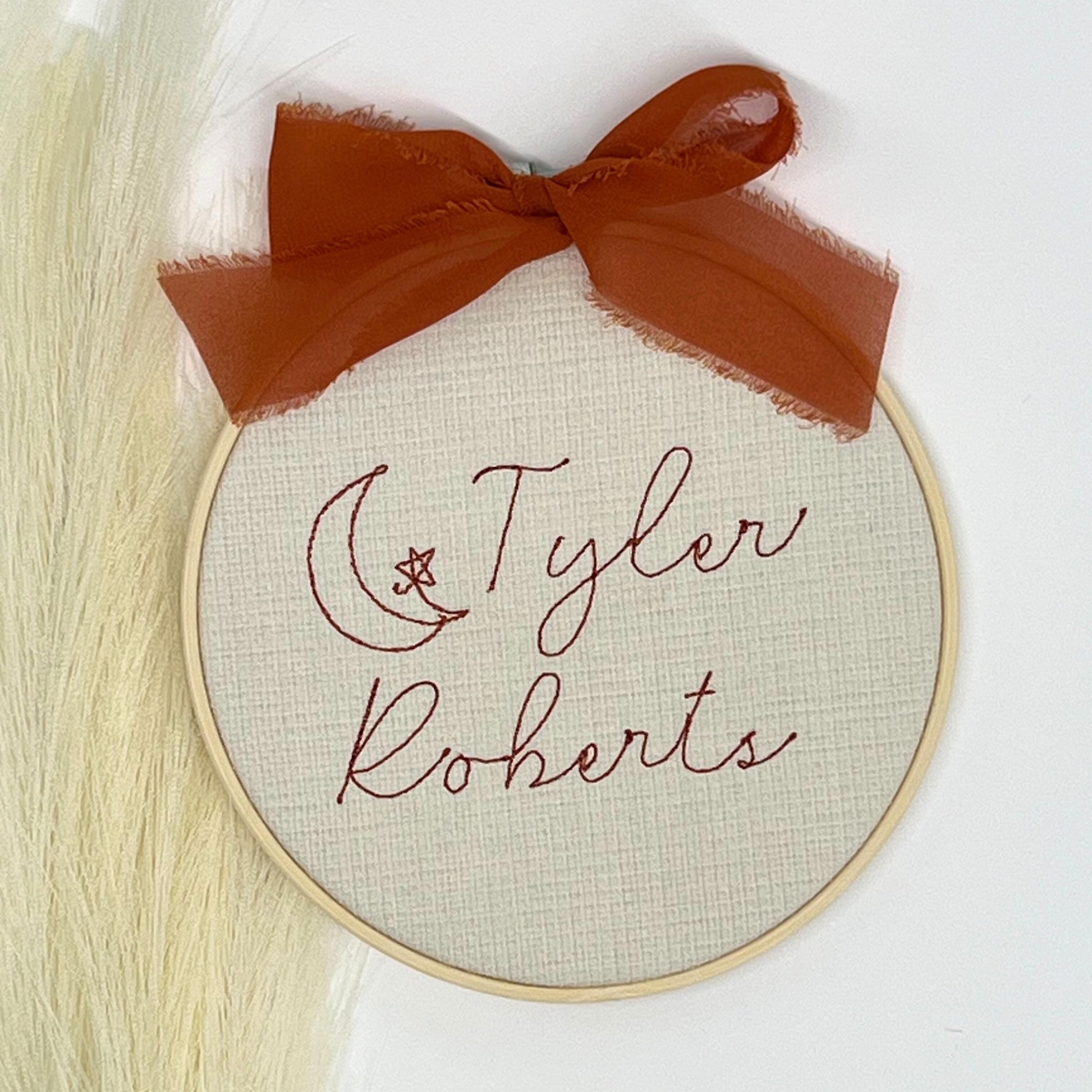 Welcome your little one with a custom embroidered name hoop — a simple, timeless keepsake for the nursery. Each piece is machine-embroidered with the detail and charm of hand stitching, crafted with care for a clean, refined finish.