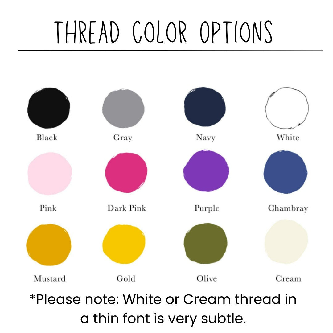 Black thread is the default and the font will be chosen based on what looks bets for the particular name if not specified in the Personalization section at checkout.