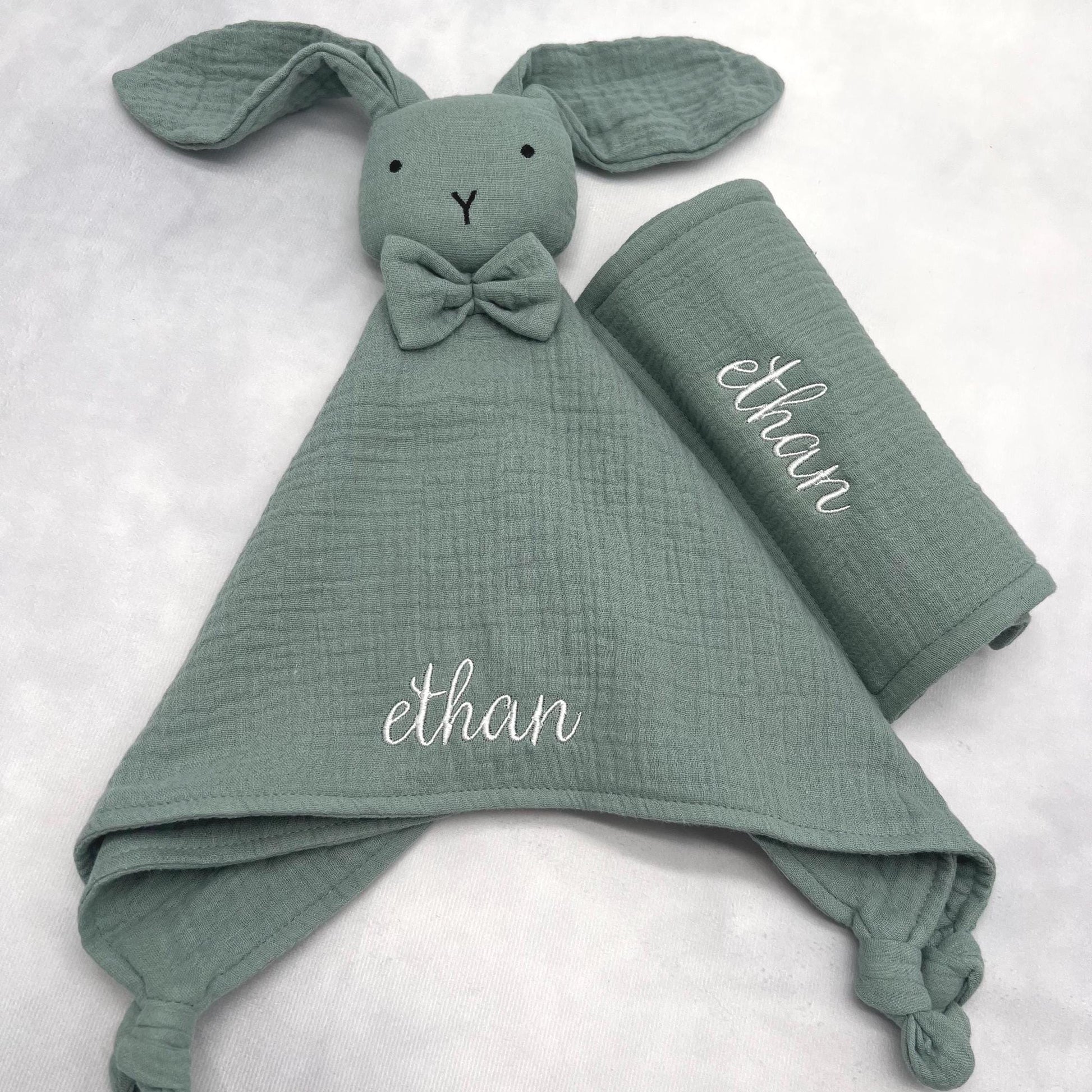 Personalized Baby Shower Gift Embroidered Organic Muslin Cotton Bunny Lovey & Burp Cloth Gift Set Baby Toy Personalized Lovey