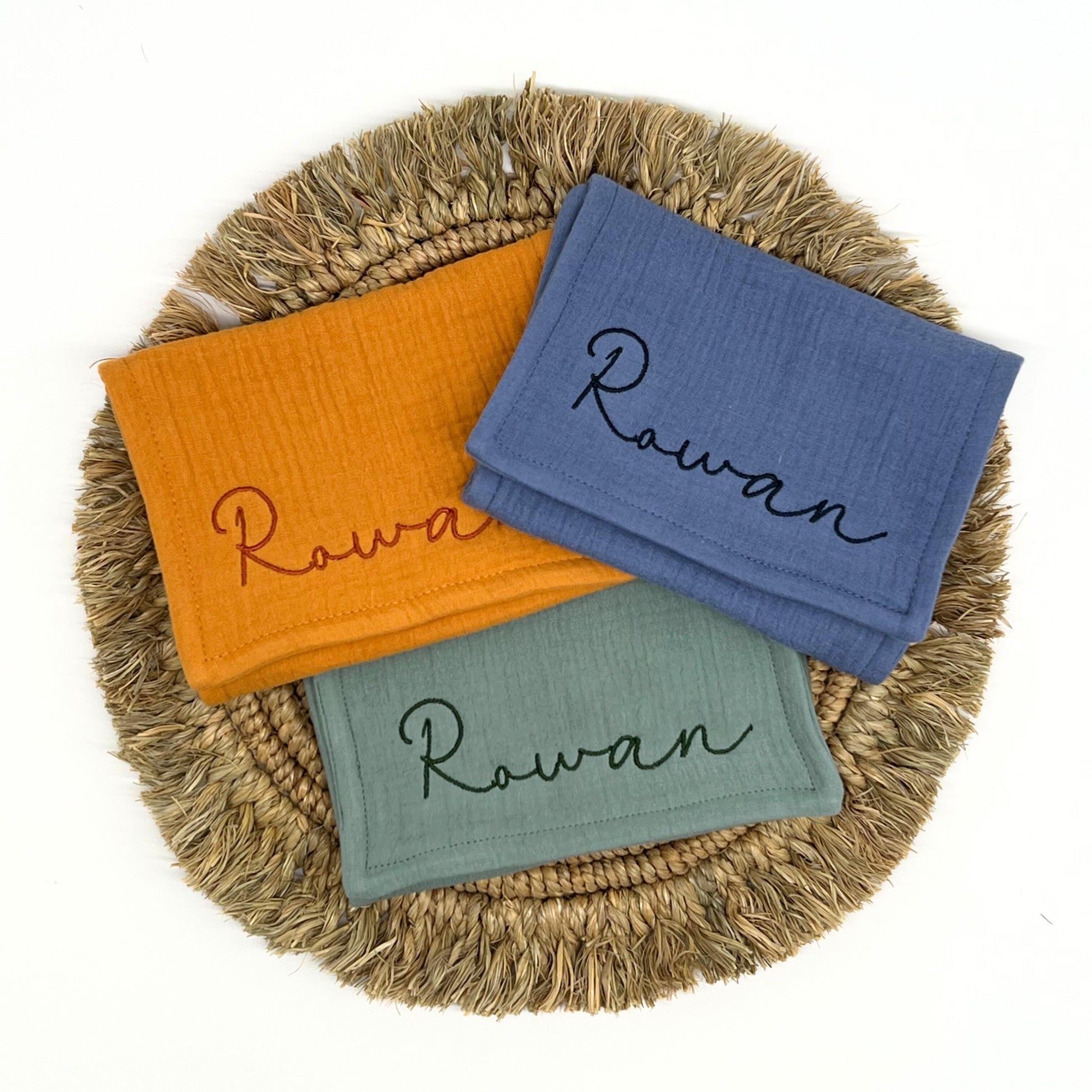 Eco-friendly, organic muslin cotton baby burp cloths - a personalized baby shower gift, embroidered with baby’s monogram or baby's name.