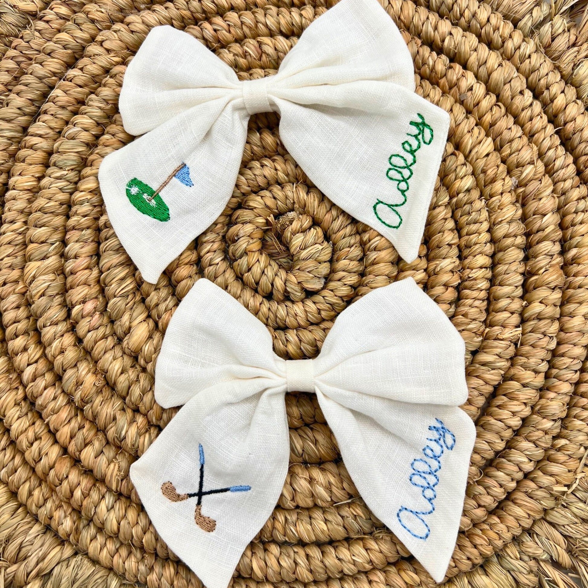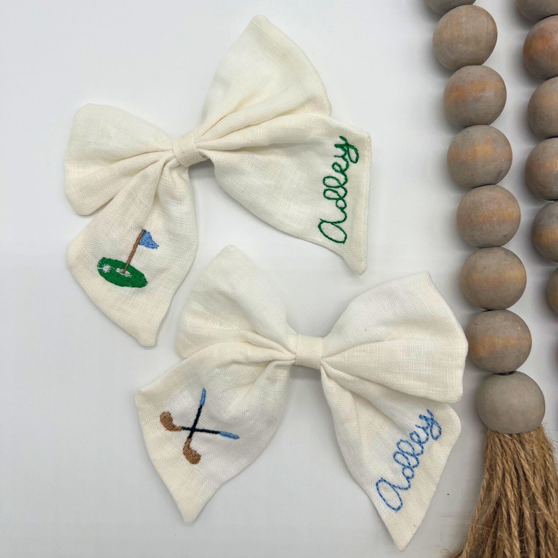 Personalized Linen Golf Hair Bow: Embroidered Name, Golf Tournament Clip