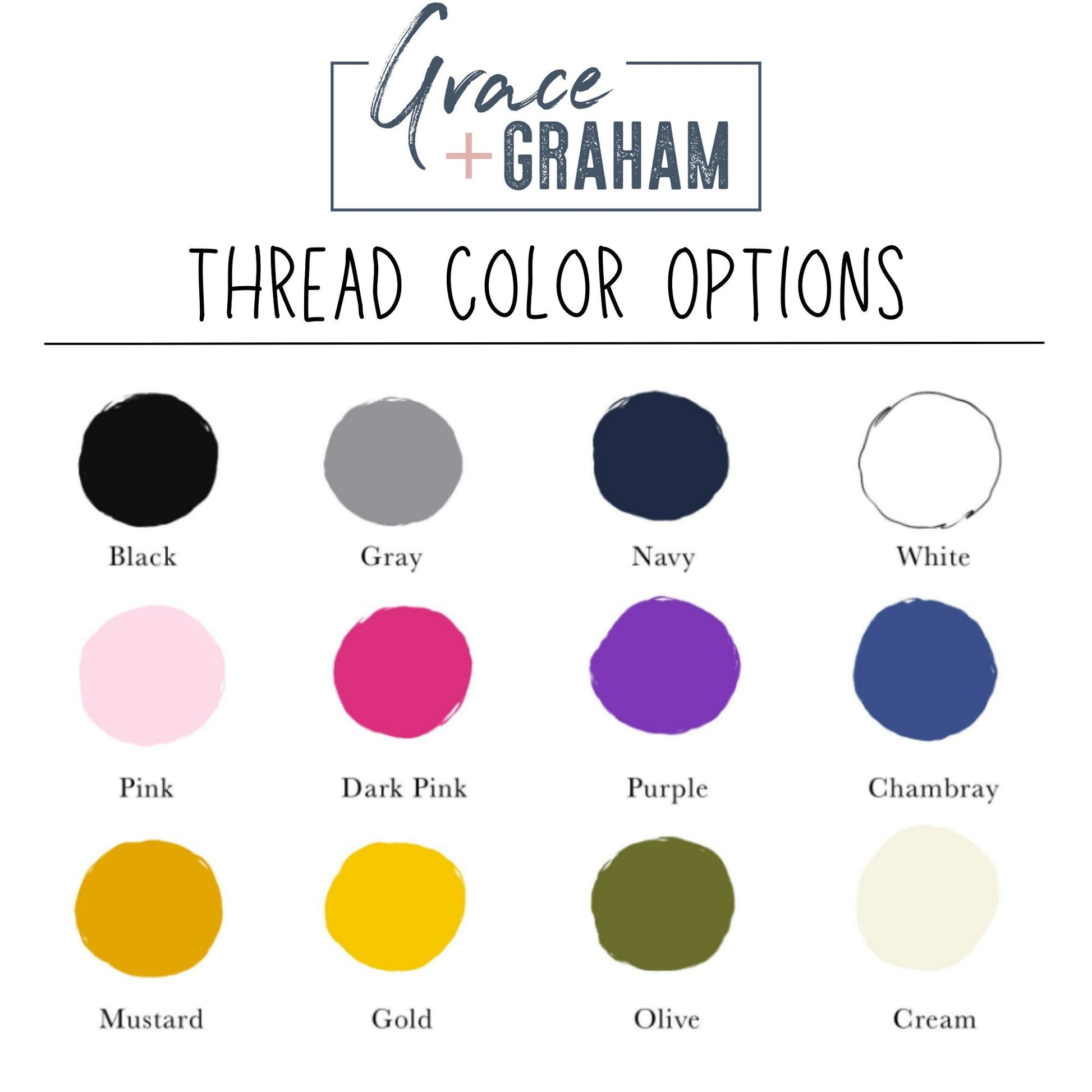 Black thread is the default and the font will be chosen based on what looks bets for the particular name if not specified in the Personalization section at checkout.