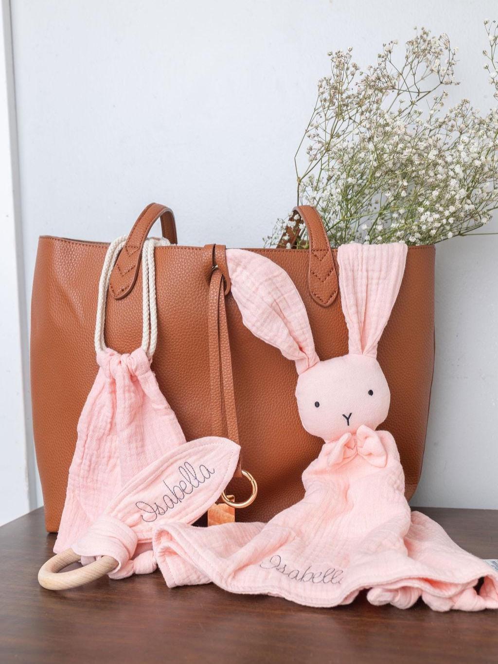 Lovey, Teether & Carrying Bag Set - Bunny lovey + Teether, both with embroidered name and a carrying case to keep lovey & teether clean in the diaper bag.
