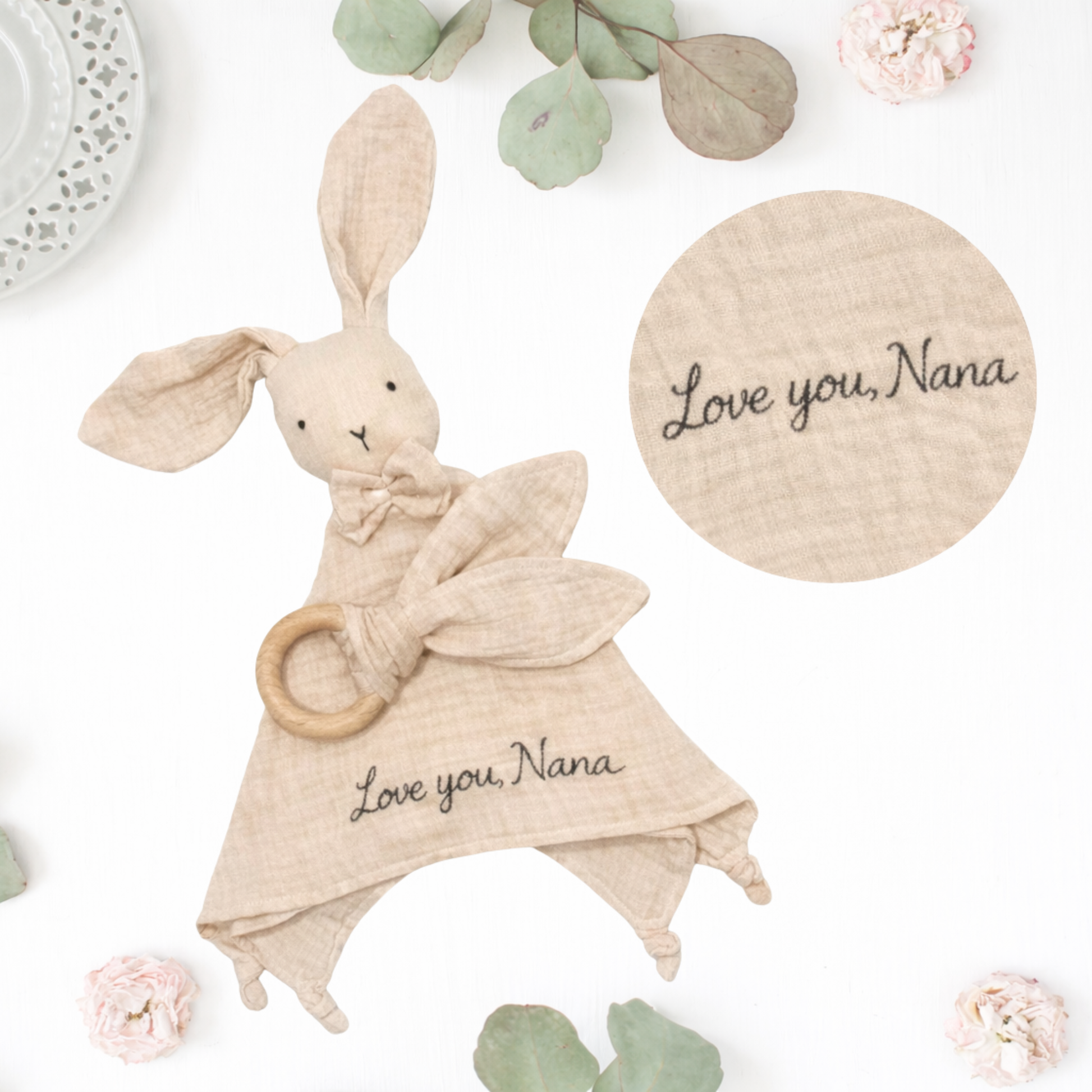 - Lovey Only – Organic muslin bunny lovey embroidered with your submitted handwriting