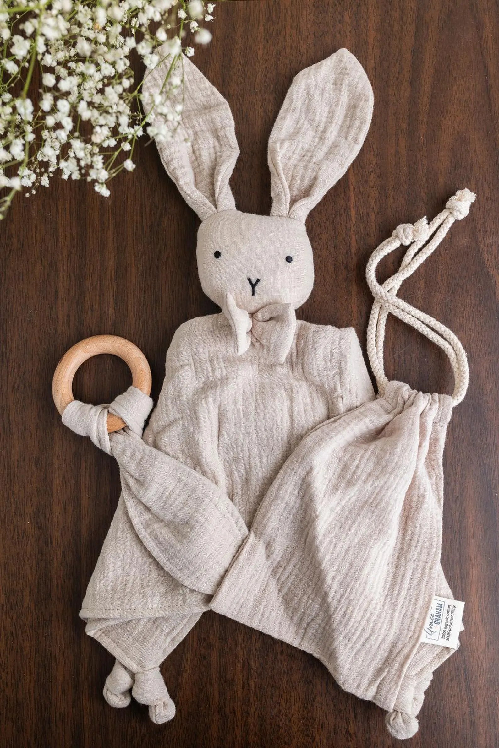 Crafted from breathable, 100% organic muslin cotton — soft, safe, and gentle for baby’s delicate skin. Its lightweight, airy texture provides comfort while encouraging self-soothing and security. Eco-friendly and ethically made, each lovey is a timeless keepsake that parents will treasure for years to come.